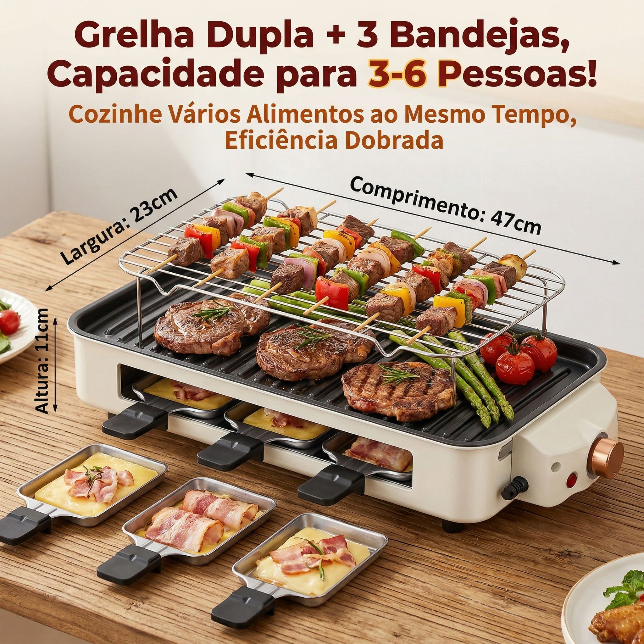 Segura e sem poluição, esta Churrasqueira Sem Fumaça não tem chamas abertas, evitando riscos à saúde e sendo segura para idosos e crianças. 🛡️ Com tamanho generoso de 47x23cm, ela tem capacidade para atender 3-6 pessoas, podendo grelhar mais de 20 espetinhos de uma vez — custo-benefício máximo para a sua família! 💯