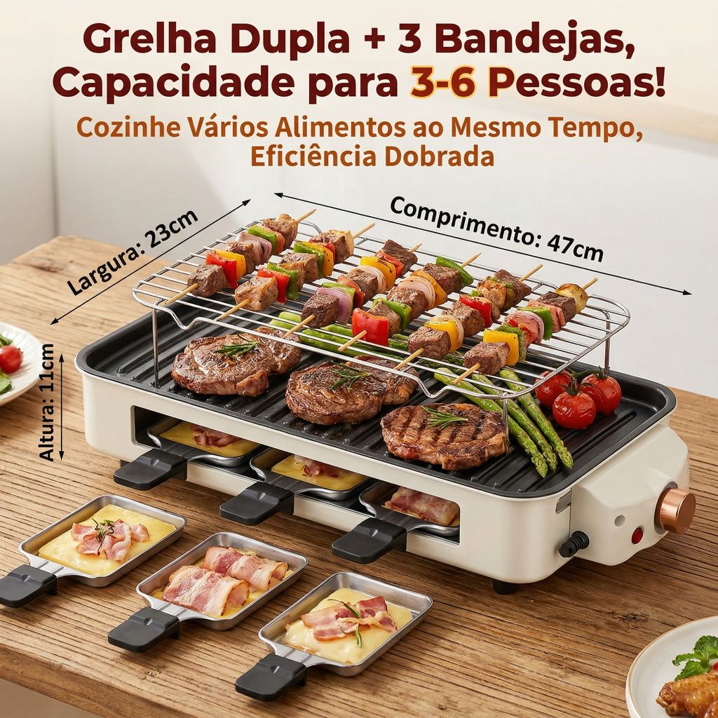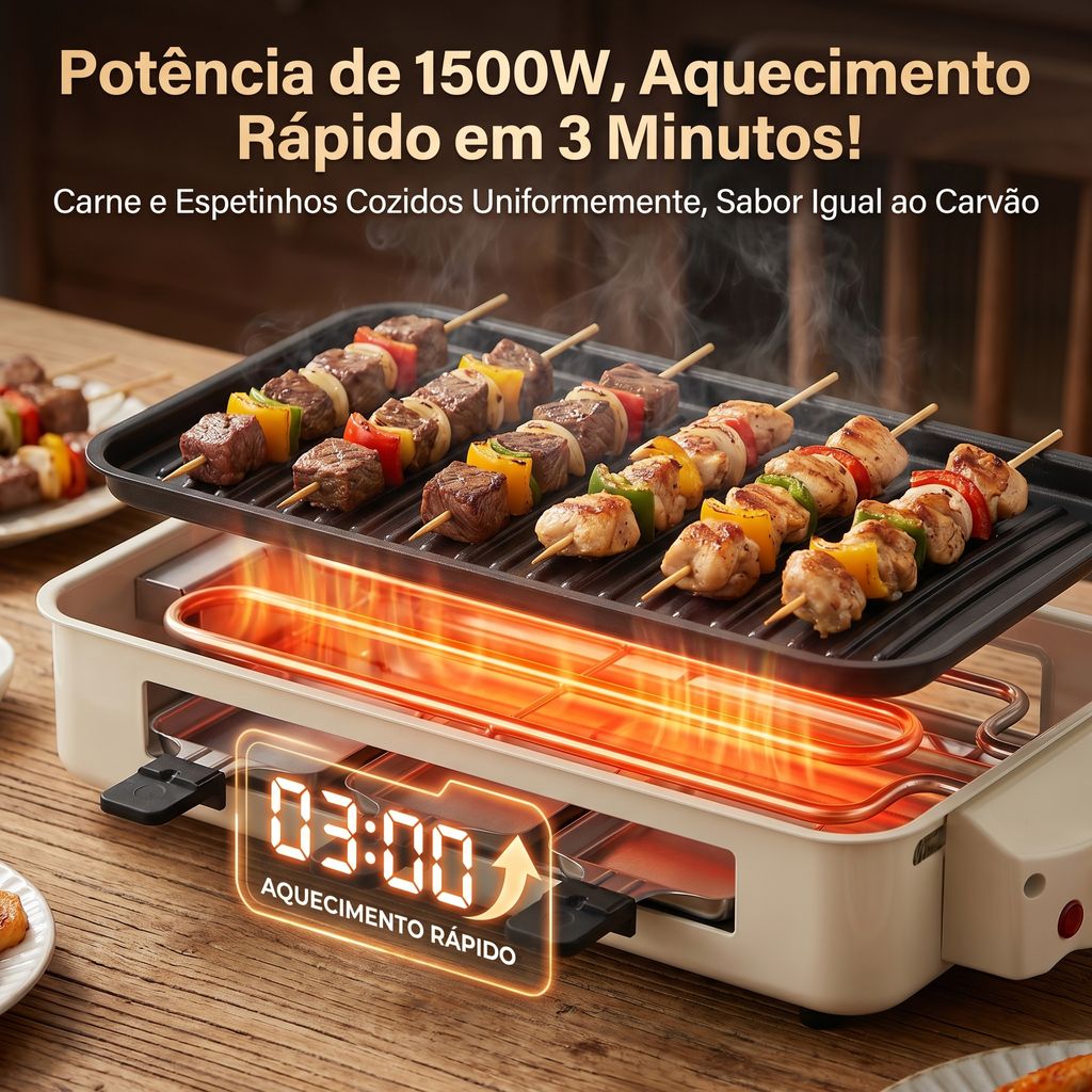 ⚡ Potência de 1500W com aquecimento rápido e uniforme, reproduzindo perfeitamente o sabor do churrasco de carvão 🔥