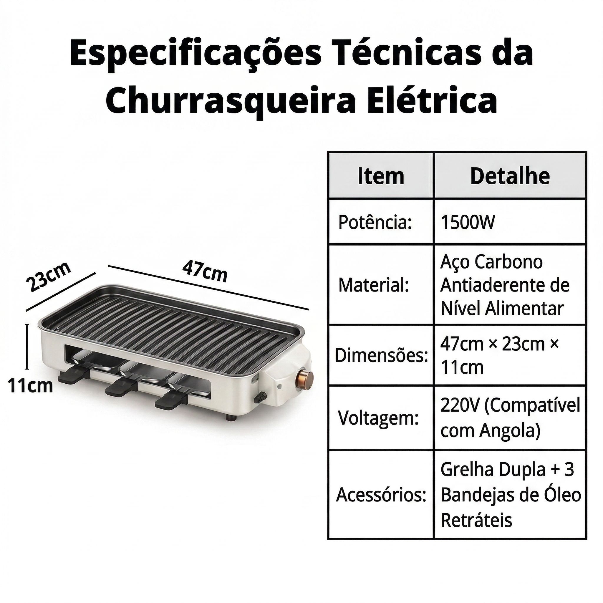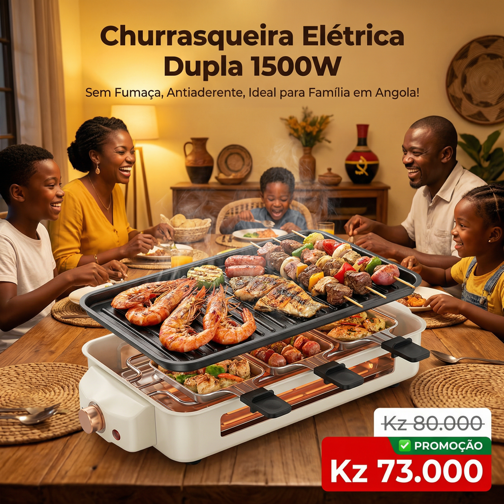 Bem-vindo a comprar a nossa Churrasqueira Elétrica multifuncional, a escolha número 1 para churrasco em Angola! Esta Churrasqueira de Dupla Grelha combina potência e praticidade, sendo ideal para todas as suas necessidades de cozinha. Com potência de 1500W, é uma Churrasqueira 1500W que aquece rapidamente em 3 minutos, garantindo que seus espetinhos, carne e vegetais fiquem uniformemente cozidos, sem ficar cru no meio. 🥩🍢