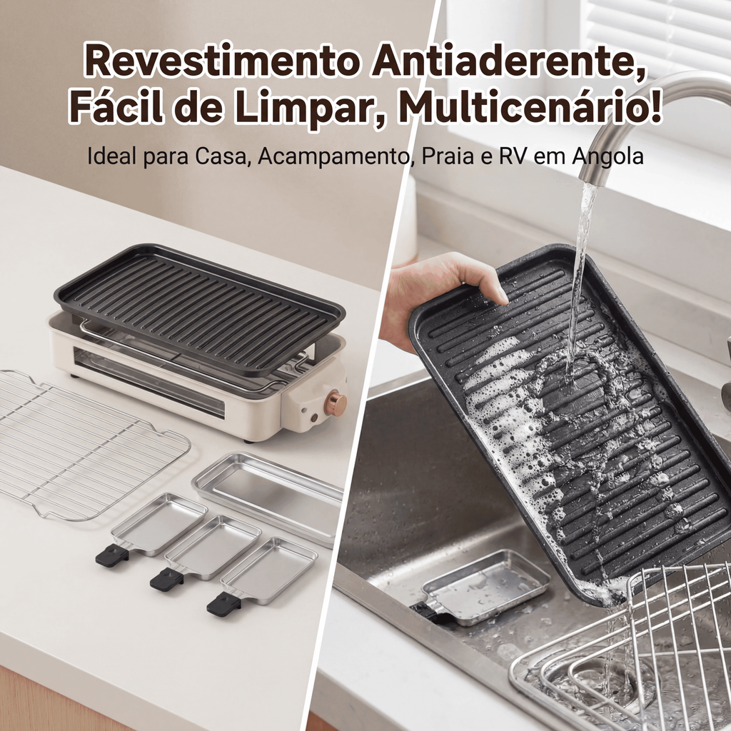 • 🧼 Churrasqueira Antiaderente: Revestimento antiaderente de aço carbono de nível alimentar, pouca fumaça e não cola, todos os componentes removíveis podem ser lavados com água, uso diário para famílias angolanas sem fardo! ✨